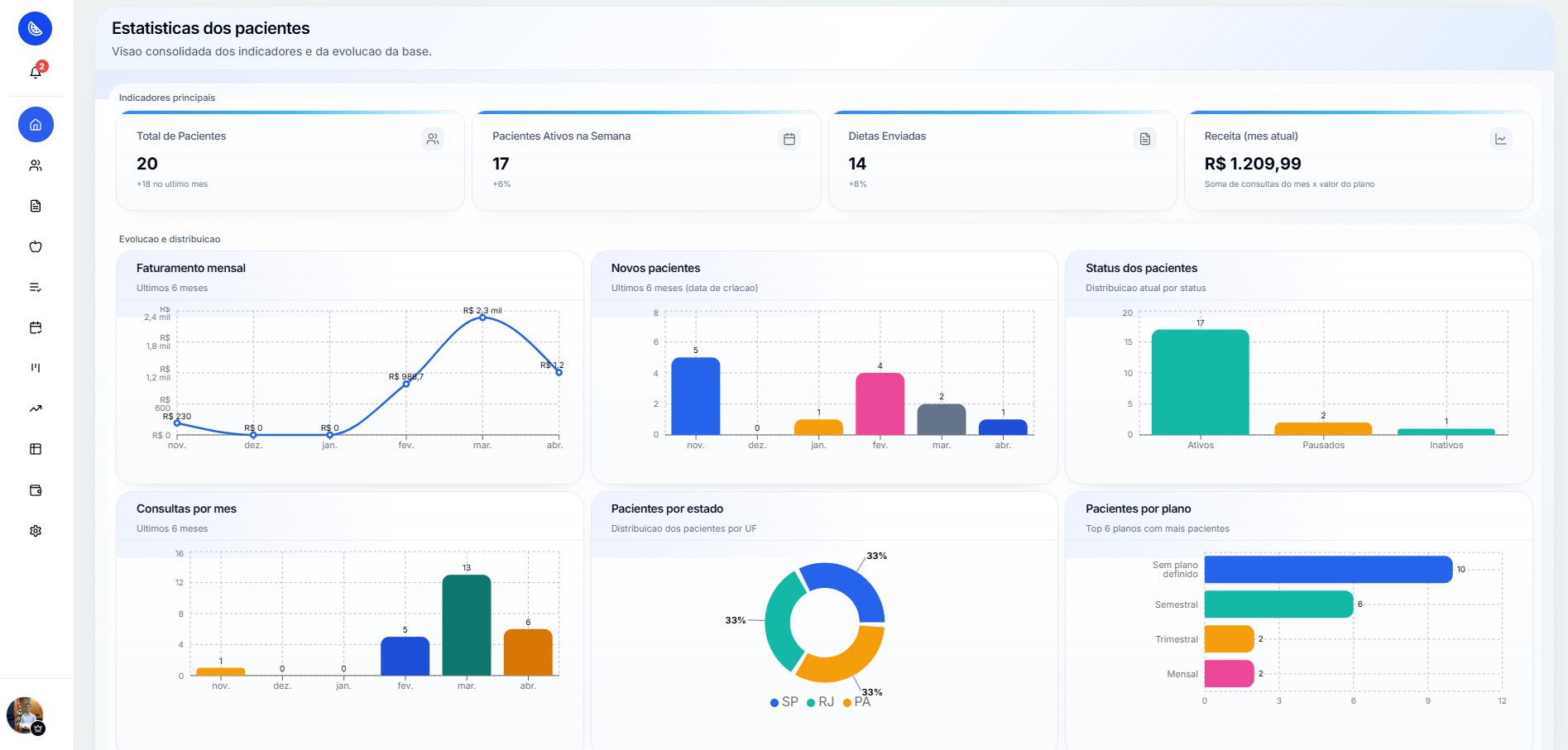 Pacientes, plano alimentar, agenda, finanças, aplicativo e IA em uma experiência mais moderna, premium e fluida.
