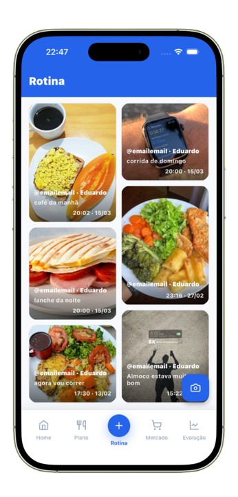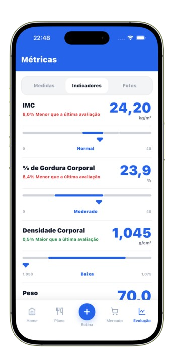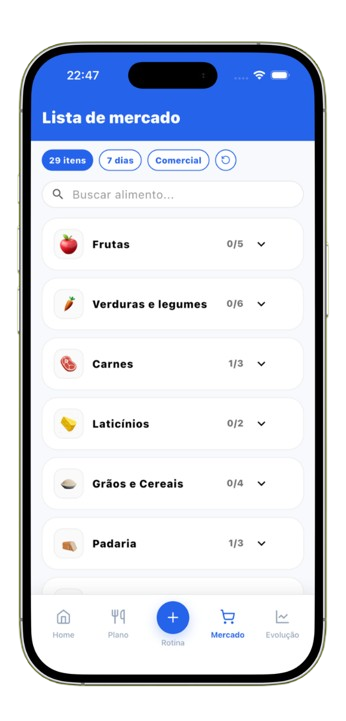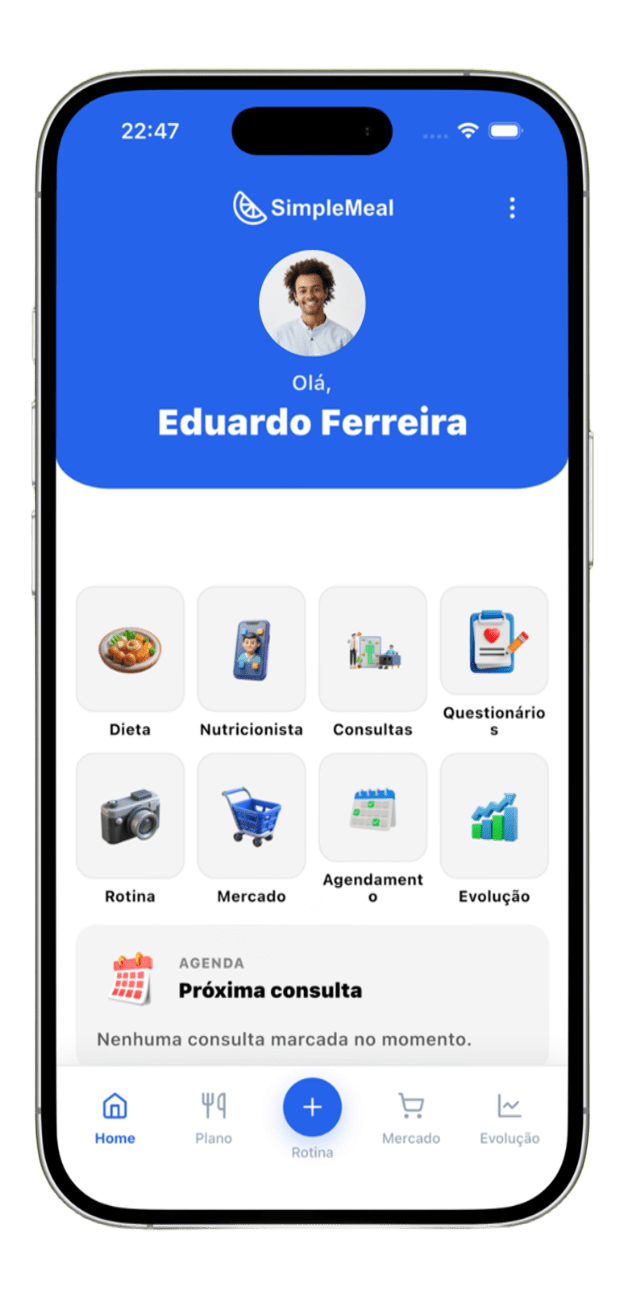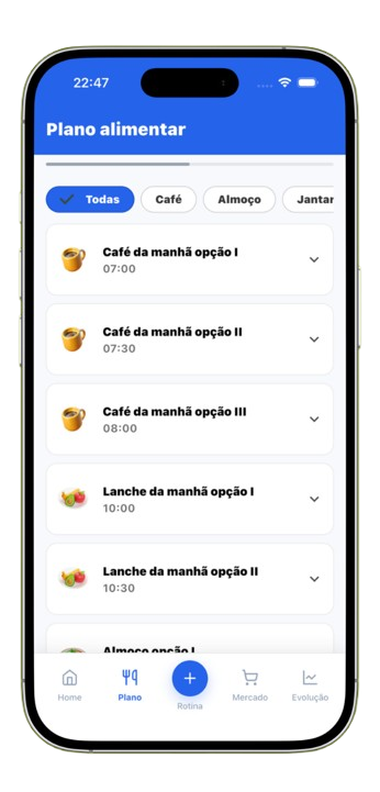 Plano alimentar, rotina, materiais e evolução ficam organizados em um só lugar, reforçando adesão e presença no dia a dia entre uma consulta e outra.